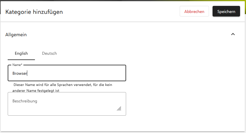Nachdem ein Name bei English angegeben ist, können sie mit einem Klick auf Speichern die Kategorie anlegen.