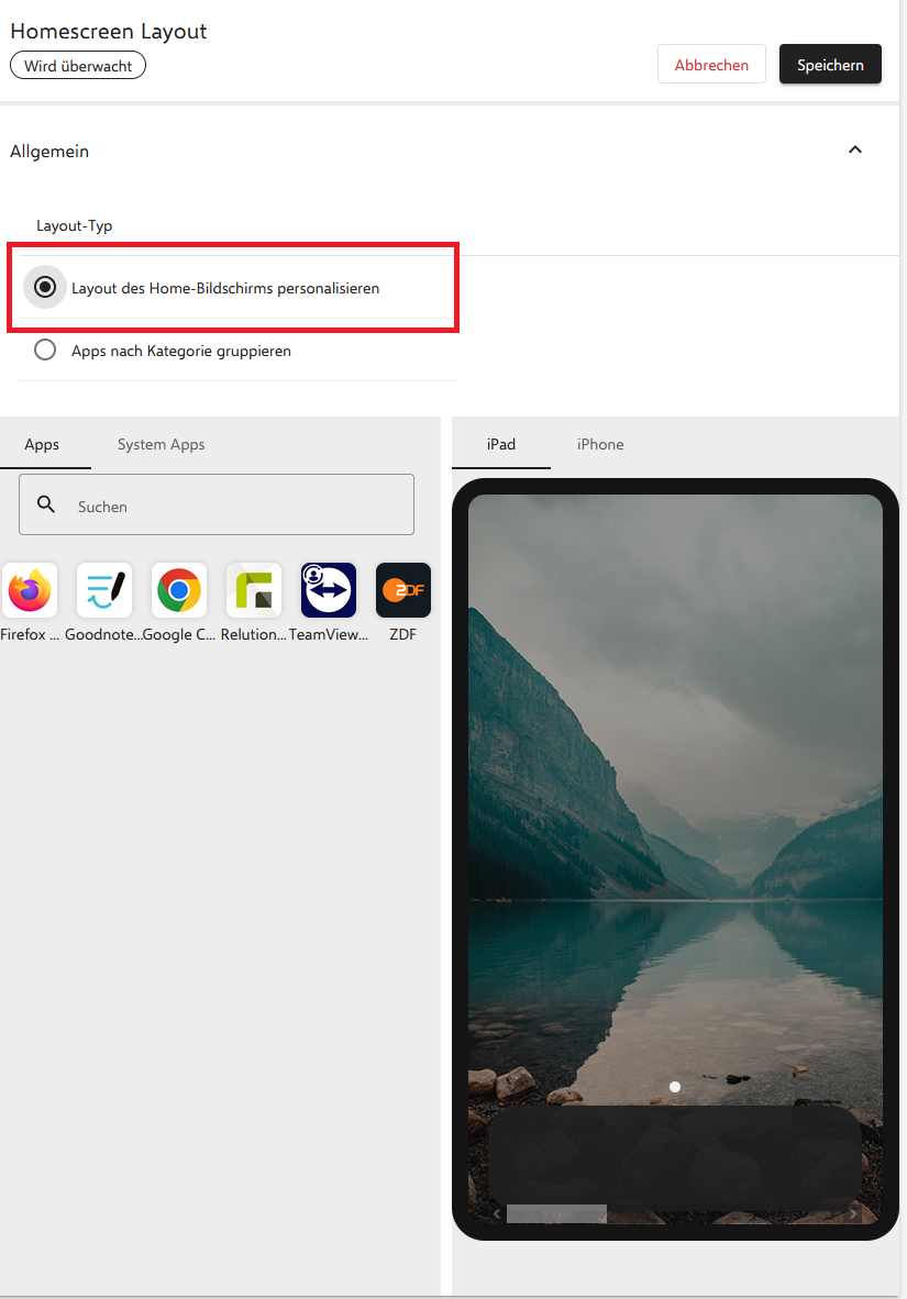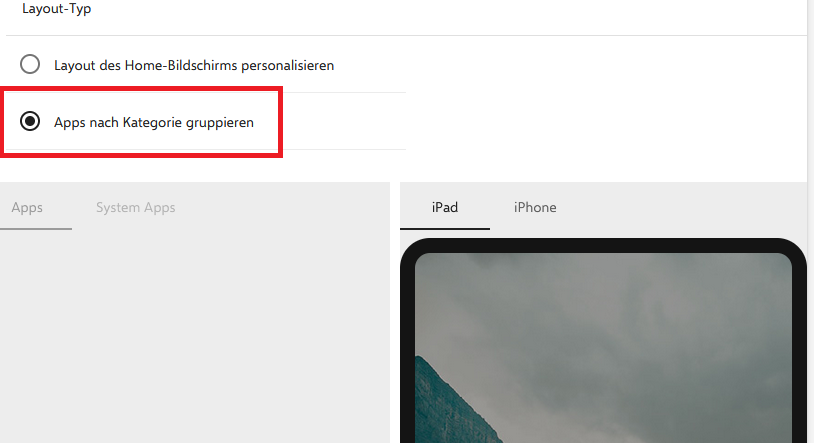 Die Kategorie, mit der die Apps auf den iPads organisiert werden können heisst Homescreen Layout.