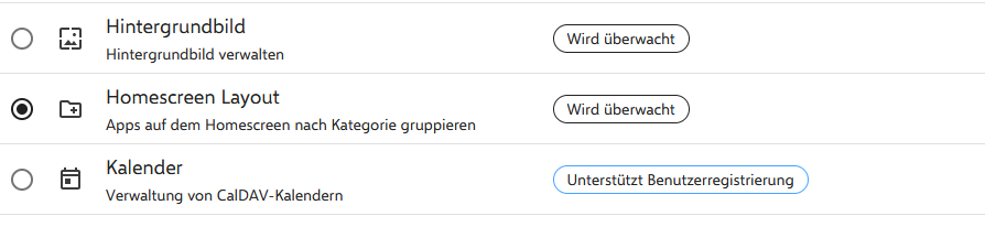 Nachdem eine Gruppe angelegt wurde, können Richtlinien eingerichtet werden, die auf die Gruppe angewendet werden sollen. Wenn die Richtlinie angelegt ist wird über Konfigurationen das Endgerät eingerichtet. Nachdem die Richtline gespeichert wurde, geht automatisch das Fenster für die Konfigurationen auf und durch +Hinzufügen können Sie die Kategorie auswählen, die Sie konfigurieren möchten.