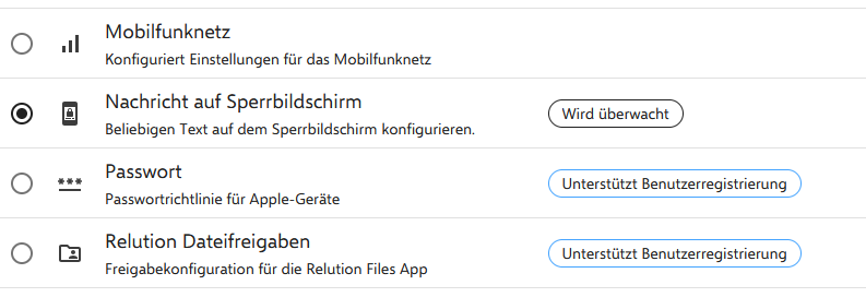 Nachdem eine Gruppe angelegt wurde, können Richtlinien eingerichtet werden, die auf die Gruppe angewendet werden sollen. Wenn die Richtlinie angelegt ist wird über Konfigurationen das Endgerät eingerichtet. Nachdem die Richtline gespeichert wurde, geht automatisch das Fenster für die Konfigurationen auf und durch +Hinzufügen können Sie die Kategorie auswählen, die Sie konfigurieren möchten.