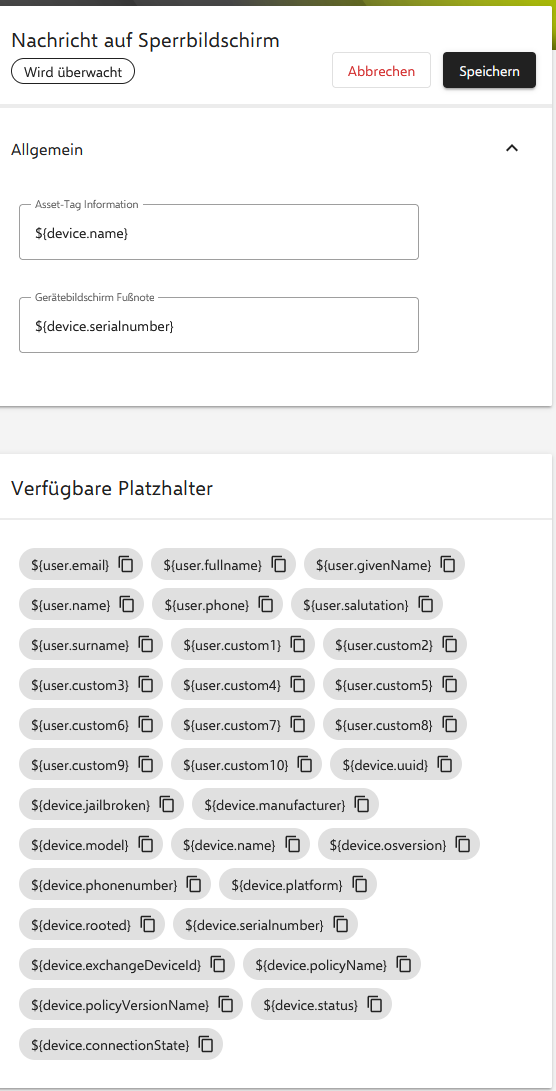 Sie können aus den verfügbaren Platzhaltern einen oder mehrere auswählen, die auf dem Sperrbildschirm des iPads unterhalb von Zum Öffnen Home-Taste drücken angezeigt werden.